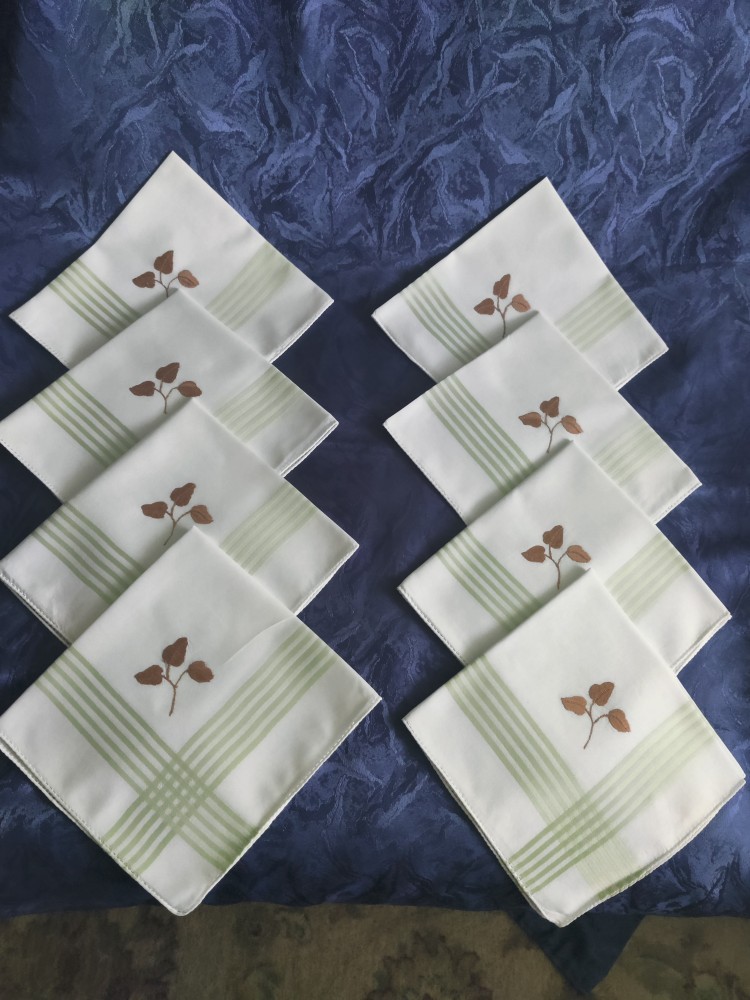 Șervetele sunt din pânză de calitate, pe unul din colturi sunt brodate 3 frunze cu maro. Sunt toate identice, prețul este pt toate împreună.