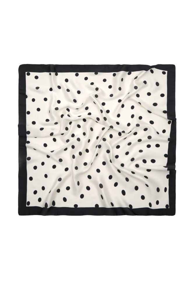 Esarfa satin patrata 70x70 cm, alba cu buline negre, realizata din matase artificiala silk feel. Eleganta, fina si versatila, ideala pentru tinute office, casual sau elegante.