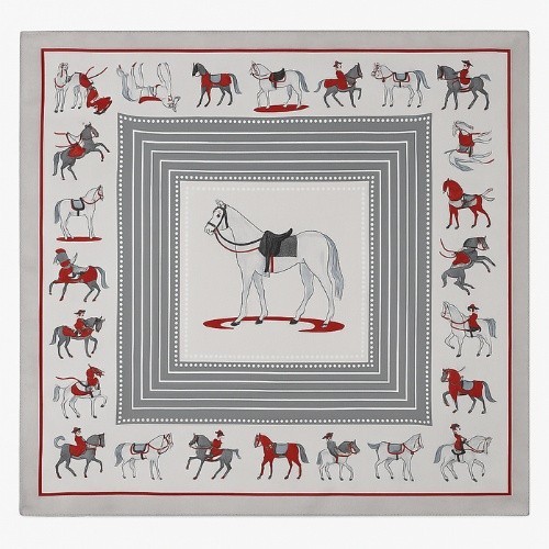 Esarfa din satin Ecvestra este un accesoriu rafinat, perfect pentru femeile care apreciaza eleganta clasica si detaliile distinctive. Designul sau original, inspirat de lumea ecvestra, imbina armonios nuante de gri, alb si rosu, conturate intr-un imprimeu sofisticat cu siluete de cai.