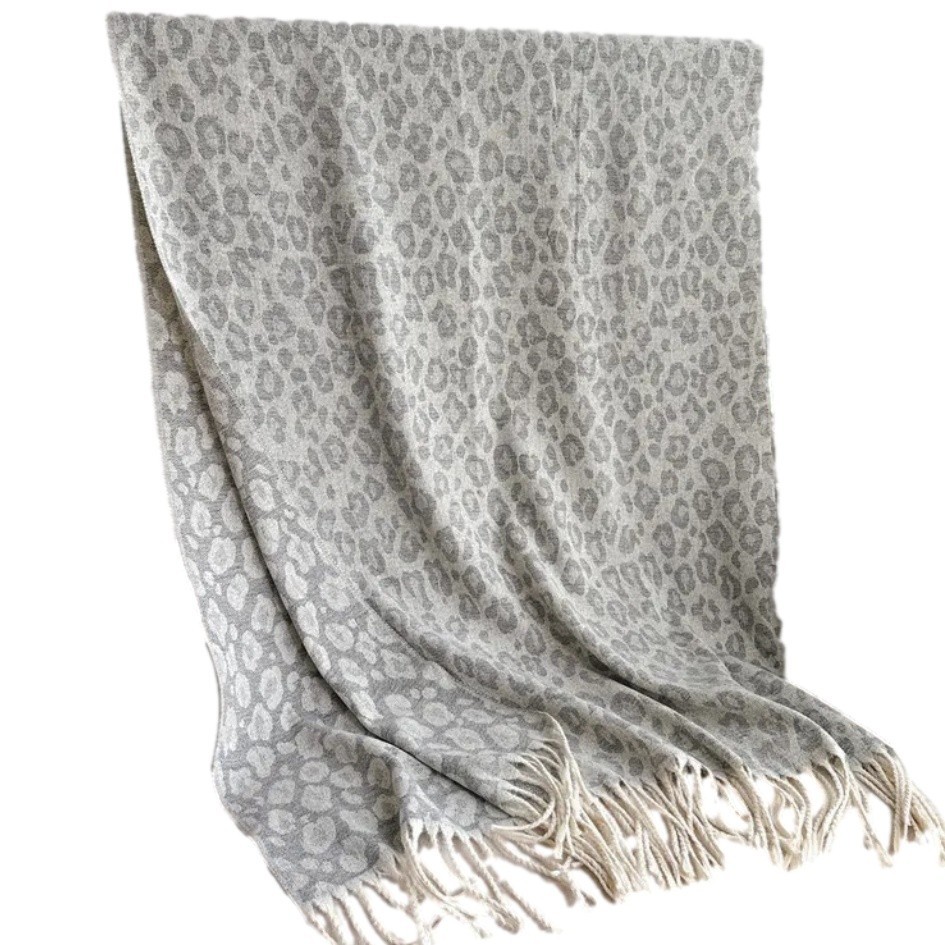 Alege esarfa gri cu imprimeu leopard si franjuri pentru un look in tendinte.