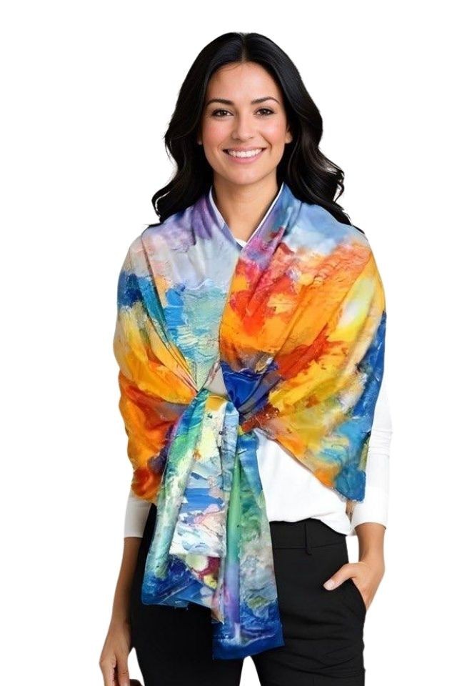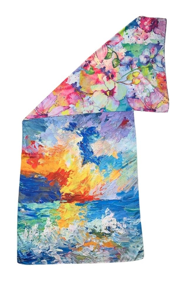 Acesta esarfa este spectaculoasa avand un model inspirat din picturi celebre pe ambele fete. Aduce un plus de eleganta si unicitate fiecarei tinute casual sau eleganta .Materialul tip matase este placut la atingere, moale si poate fi purtat in orice sezon .Schimbati imaginea purtand o esarfa cu personalitate.