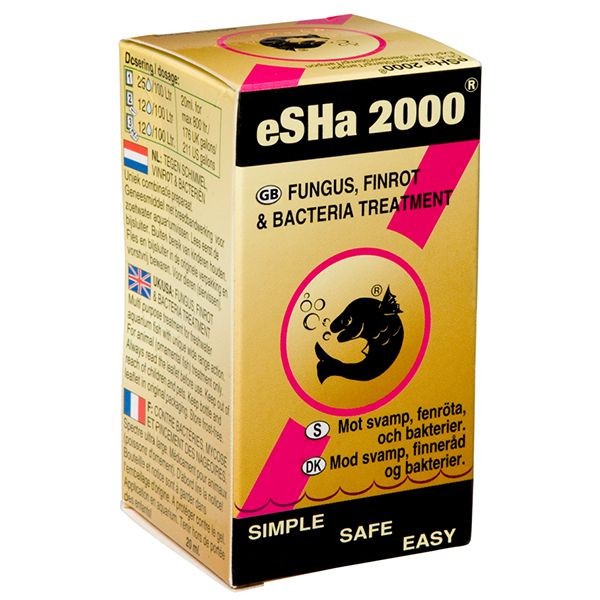 Esha 2000 cu o rază largă de acțiune de peste 18 simptome și organisme de boală. Esha 2000 tratează infecții primare și secundare fungice, infecții bacteriene ale pielii și ale paraziților pielii/branhiale. Un avantaj în plus este capacitatea sa de a ajuta vindecarea rănilor și pentru a proteja stratul de piele. Utilizați Esha 2000 pentru ciuperci, hidropizie, bacterii, probleme ale pielii, probleme cu ochiuri mari, putregai fin, putregai coada, ulcere și răni. De asemenea, pentru boli la peștii neon tetra și multe altele. Pot fi utilizate și pentru prevenire și dezinfectare.