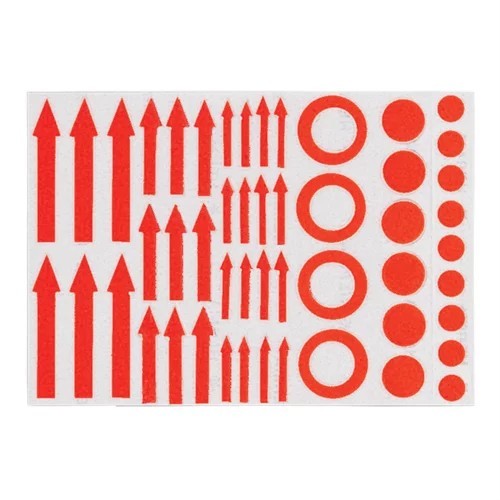 Semne filatelice autoadezive de culoare rosie. 3 tipuri de sageti de diferite dimensiuni. 2 tipuri de buline de diferite dimensiuni. 1 tip de cercuri.