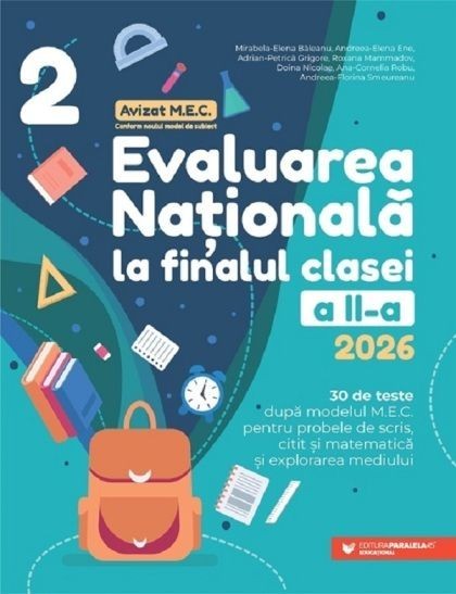 Evaluarea Nationala la finalul clasei a II-a 2026. 30 de teste dupa modelul M.E.C. pentru probele de scris, citit si matematica si explorarea mediului\r\n \r\nAvizat M.E.C.\r\n \r\nLucrarea de fata se adreseaza elevilor de clasa a 2-a in vederea sustinerii cu succes a probei de evaluare a competentelor generale si specifice la finalul anului scolar. Proba consta in administrarea a trei teste vizand evaluarea competentelor de receptare a mesajelor citite, evaluarea competentelor de producere a mesajelor scrise si evaluarea competentelor de matematica. Testele propuse respecta intru totul standardele metodologice elaborate de Ministerul Educatiei.\r\n \r\nAceasta evaluare are deja o traditie de cativa ani in invatamantul romanesc. Ea nu reprezinta un examen sau un concurs, ci are un caracter formativ, de diagnoza si prognoza, cadrul didactic urmarind de fapt optimizarea, reglarea si ameliorarea procesului de predare-invatare. Rezultatele obtinute la aceasta evaluare ofera profesorului posibilitatea de a elabora planuri individualizate de invatare, iar parintilor, un reper al progresului scolar al propriilor copii.\r\n