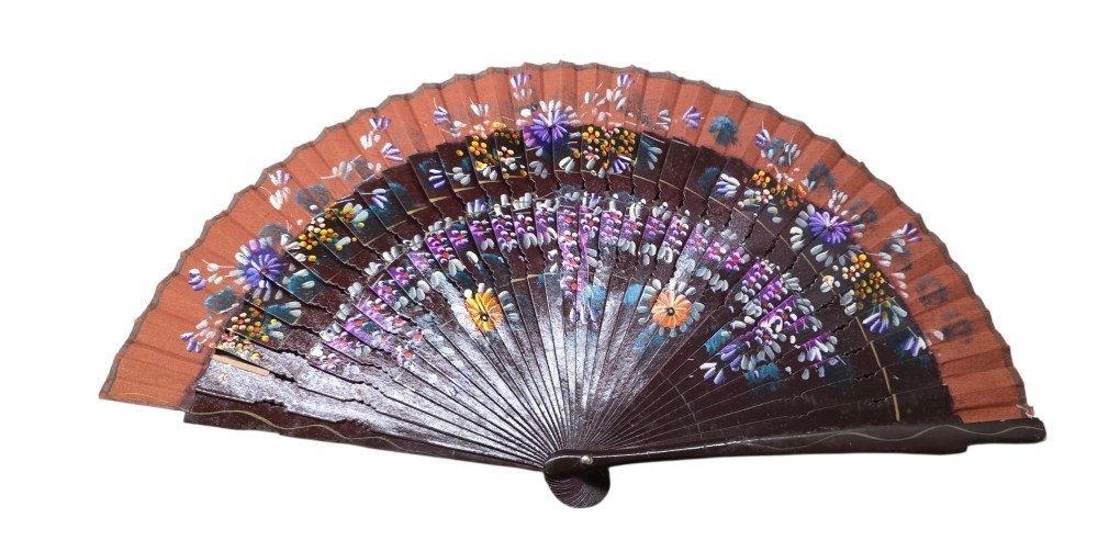 Evantai vintage pliabil din lamele subțiri de lemn vopsit în nuanțe închise și material textil montat pe structură, decorat manual cu motive florale multicolore aplicate în tehnică picturală. Marginea este decupată fin manual, iar elementul de prindere este din metal auriu.