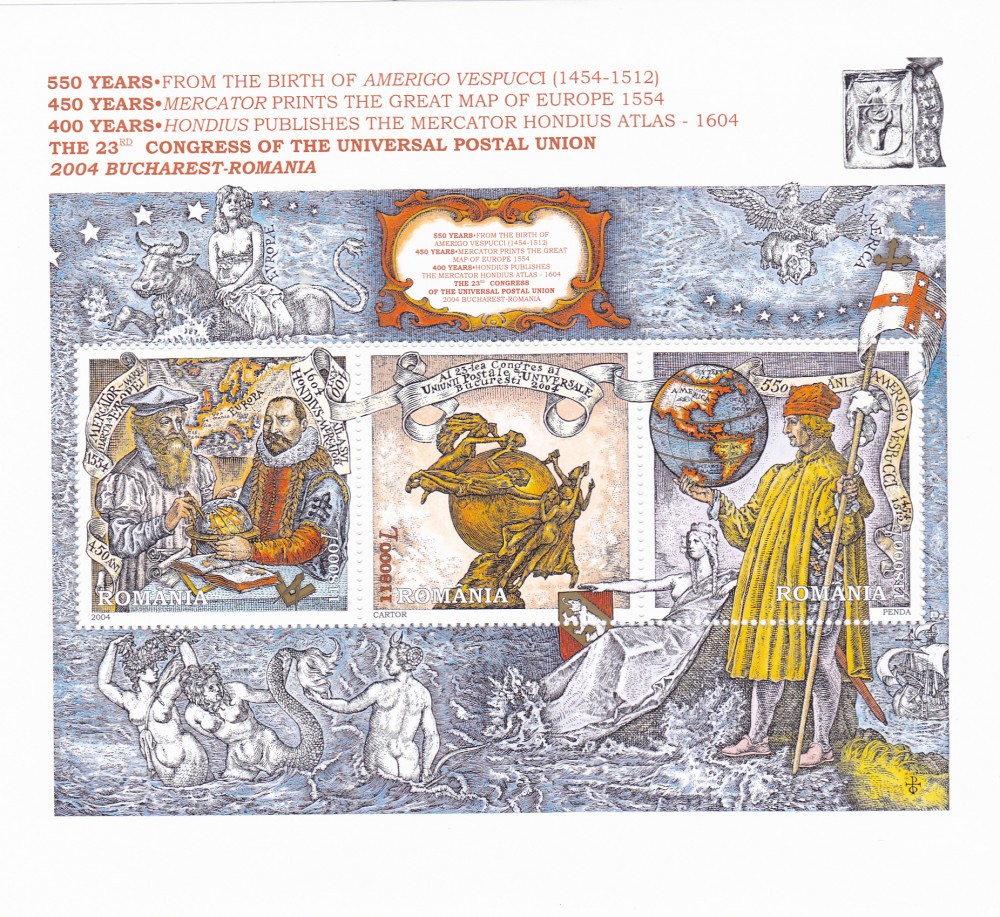 Este fără nici un dubiu una din cele mai frumoase machetări româneşti moderne. Realizată grafic (gravură) de Octavian Penda, coala / coliţa îi arată pe navigatorul Amerigo Vespucci (valoarea din dreapta) şi pe cartografii Mercator (cel care e la originea proiecţiilor globului pământesc care sunt standardul azi) şi Hondius. Valoarea centrală arată emblema Uniunii Poştale Universale (UPU).