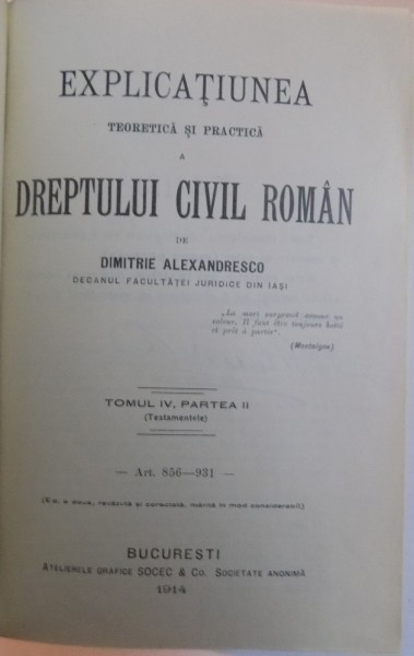 EXPLICATIUNEA TEORETICA SI PRACTICA A DREPTULUI CIVIL ROMAN de DIMITRIE ALEXANDRESCO ,1914 ,TOMUL IV PARTEA II