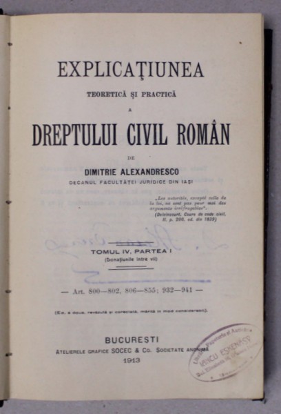 EXPLICATIUNEA TEORETICA SI PRACTICA A DREPTULUI CIVIL ROMAN de DIMITRIE ALEXANDRESCO ,TOMUL IV PARTEA I ,BUCURESTI 1913