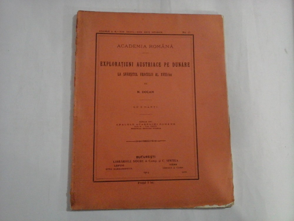 EXPLORATIUNI AUSTRIECE PE DUNARE LA SFARSITUL VEACULUI AL XVIII-lea - N. DOCAN - Bucuresti, 1914 - 169 pag.