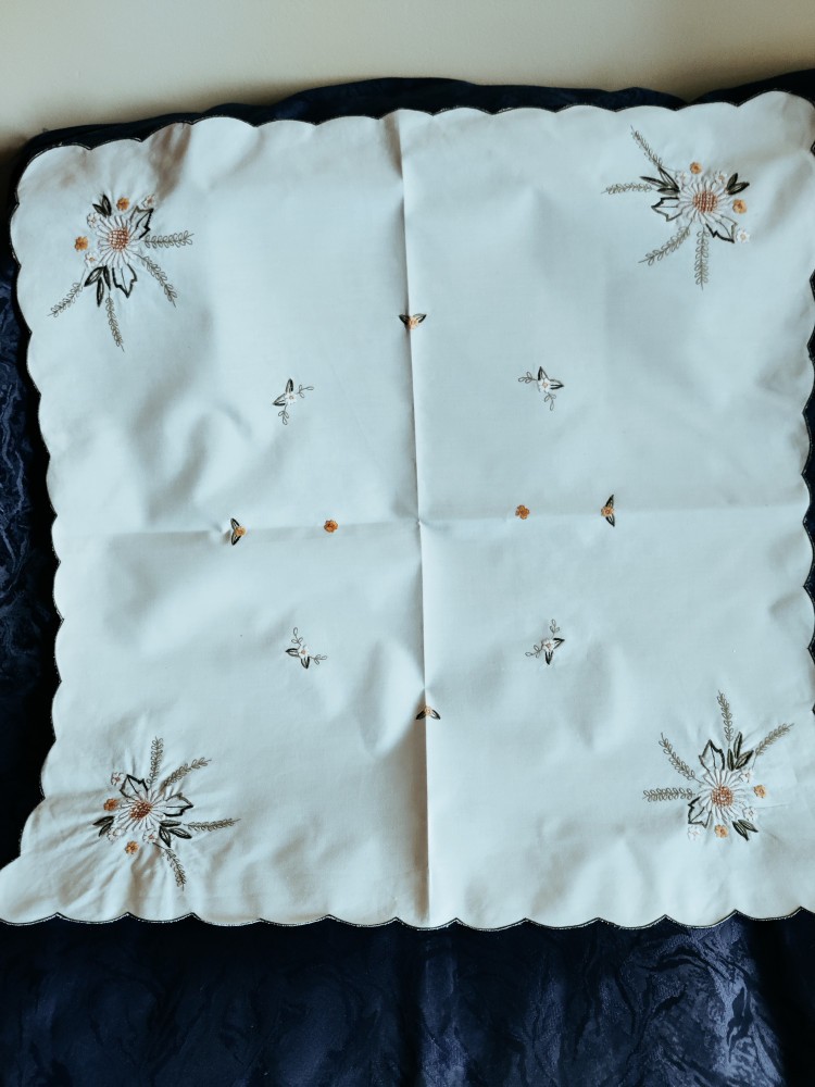 Fața de masă este din pânză albă de bumbac, broderie mecanică model floral.