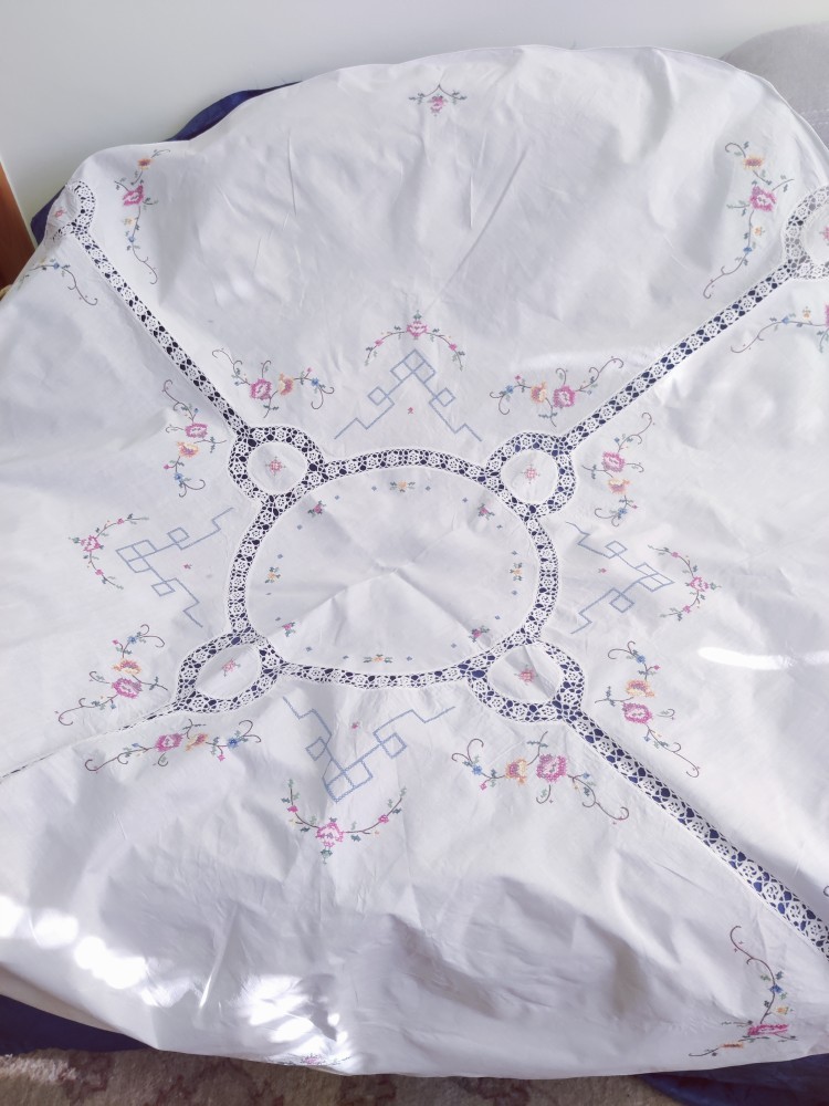 Fața de masă din pânză albă de bumbac, model floral cruciulițe, dantelă manuală inserată.