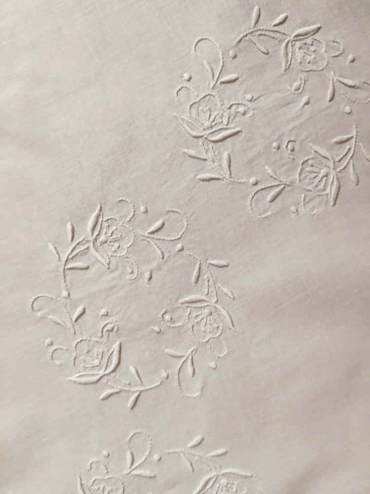 Fața de masă este un obiect vintage în stare foarte bună. Este din pânză albă de bumbac cu broderie albă model floral.
