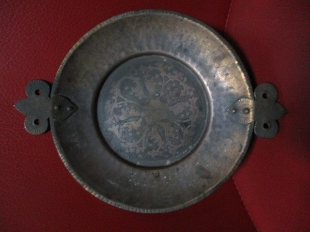 Piesa de arama prelucrata manual, cu medalion in partea centrala, prevazuta cu doua tortite nituite pe corpul farfuriei, stare buna, diametrul - 22 cm