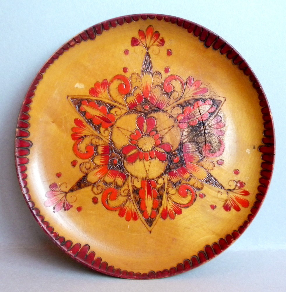 Farfurie florala decorativa din lemn, pirogravata si pictata manual