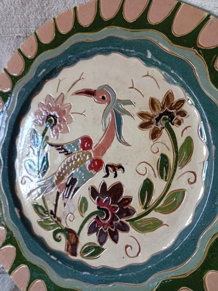Farfurie - platou, decorativă, cu dimensiuni mari diametrul de 31 cm., ceramică smălțuită, cu motive florale și animale.