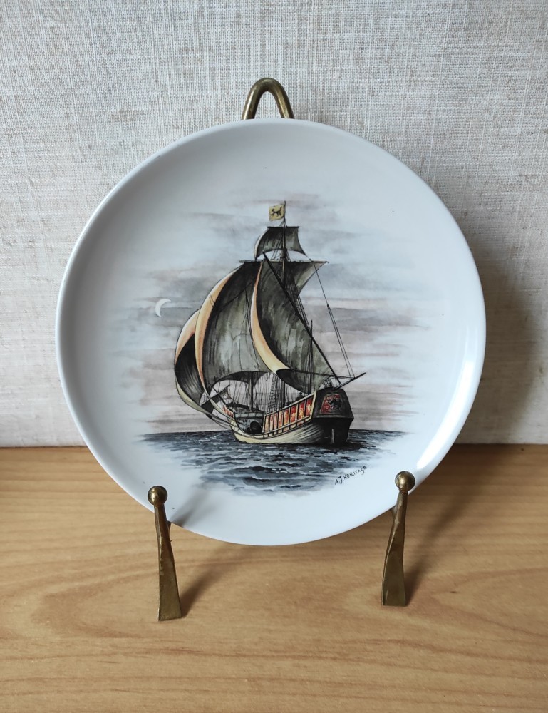 Farfurie porțelan, de colecție, model cu corabie. Reprezintă corabia lui Cristofor Columb, Santa Maria, 2492.