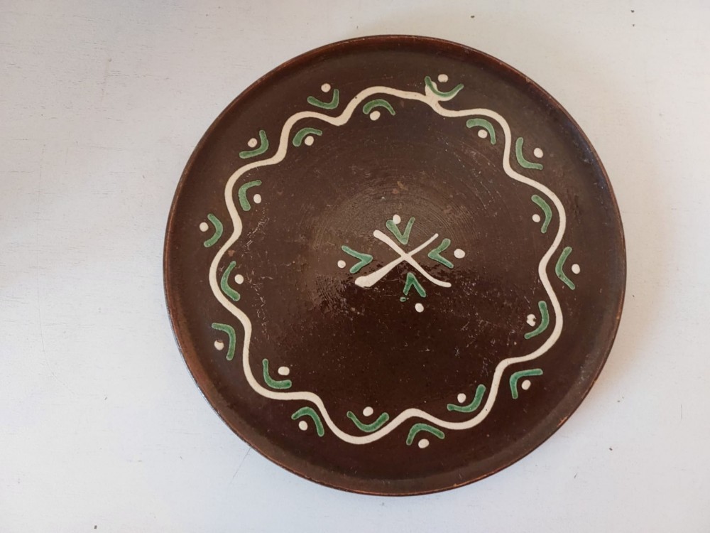 Farfurie plata veche taraneasca - lut ars, decorat si smaltuit