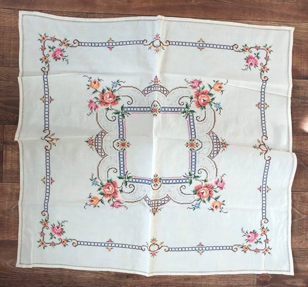Fata de masa broderie cusatura de mana in cruciulita, pe panza de bumbac, lucru manual, 78 x 82cm