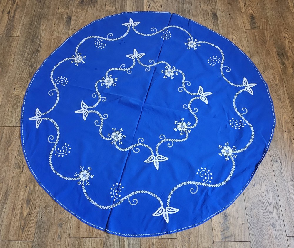 FATA DE MASA MARE CIRCULARA DIN BUMBAC PE CULOARE ALBASTRA CU MODEL BRODERIE MANUALA.