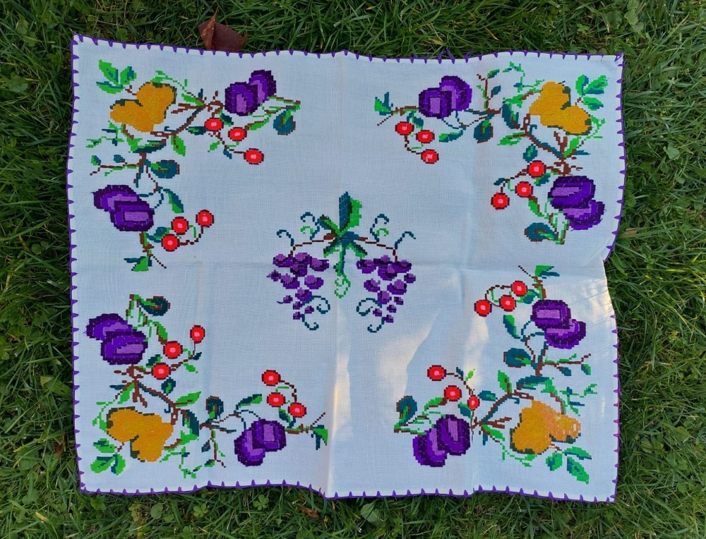 fata de masa lucru manual, cusatura de mana, cu fructe - struguri pere, prune, cirese, 62x75cm