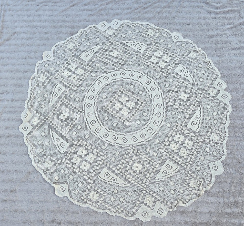 Fata de masa mare circulara vintage din in ivoryu, lucrata complet manual în rețea înnodata prin tehnica filet.