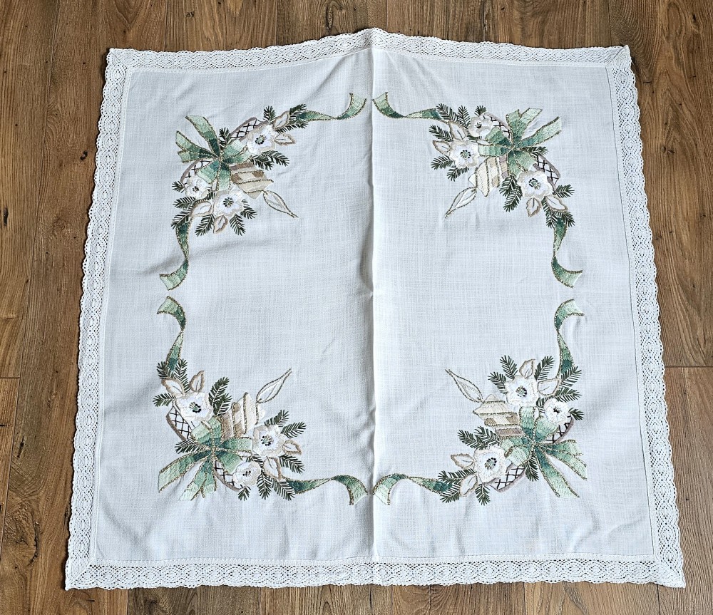 FATA DE MASA VINTAGE DIN MATERIAL SINTETIC CU MODEL BRODERIE MECANIZATA SI MARGINI CROSET. STARE DE CONSERVARE: BUNA