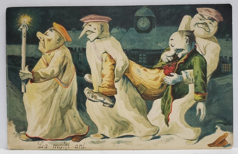 FELICITARE CU SCENA COMICA , CROMOLITOGRAFIE , EMBOSATA , CARTE POSTALA , INCEPUTUL SEC. XX