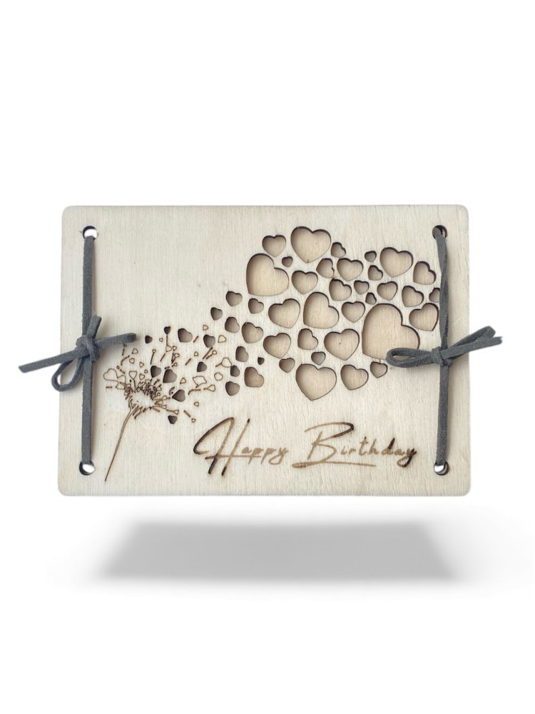 Felicitarea din lemn gravată laser reprezintă o alternativă elegantă la felicitarea tradițională, oferind posibilitatea de a transmite un mesaj special într-o formă modernă și practică. Este alcătuită din două plăci de placaj de 3 mm, prinse între ele cu un șnur din piele ecologică, disponibil în diverse culori. În interior se poate adăuga un card cadou sau se poate scrie direct un mesaj pe suprafața din lemn. Produsul este livrat în variantă nefinisată, pentru a permite personalizarea prin vopsire, baițuire sau lăcuire, în funcție de preferințele fiecăruia.