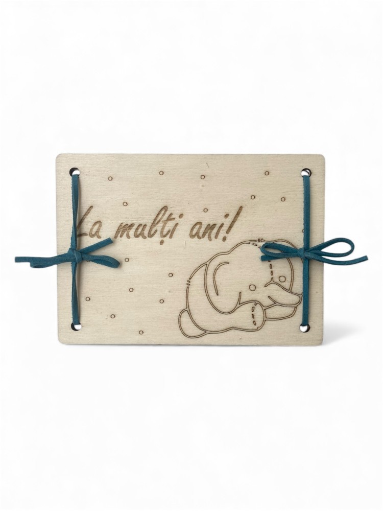 Felicitarea din lemn gravată laser reprezintă o alternativă elegantă la felicitarea tradițională, oferind posibilitatea de a transmite un mesaj special într-o formă modernă și practică. Este alcătuită din două plăci de placaj de 3 mm, prinse între ele cu un șnur din piele ecologică, disponibil în diverse culori. În interior se poate adăuga un card cadou sau se poate scrie direct un mesaj pe suprafața din lemn. Produsul este livrat în variantă nefinisată, pentru a permite personalizarea prin vopsire, baițuire sau lăcuire, în funcție de preferințele fiecăruia.