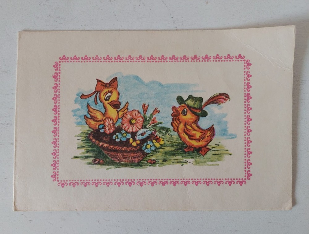 Felicitare veche anii 80 (1981) cu cos cu flori si doua ratuste