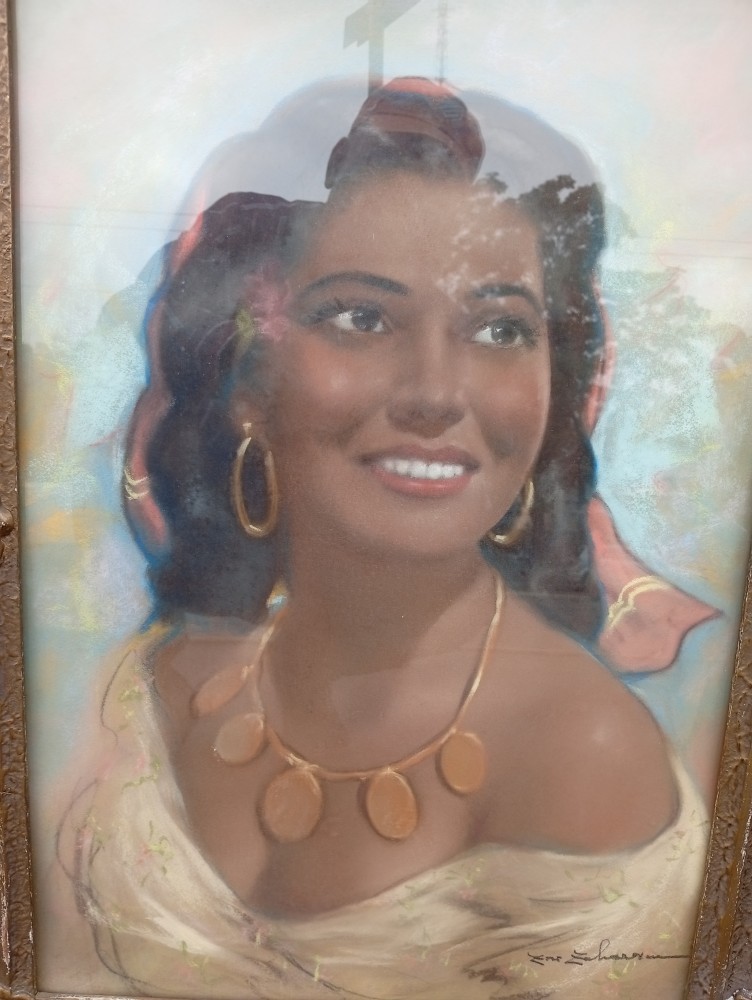 Tablou iconic pentru anii 1940-1960, gen Hollywood, personaj feminin cu salbă de aur la gât.