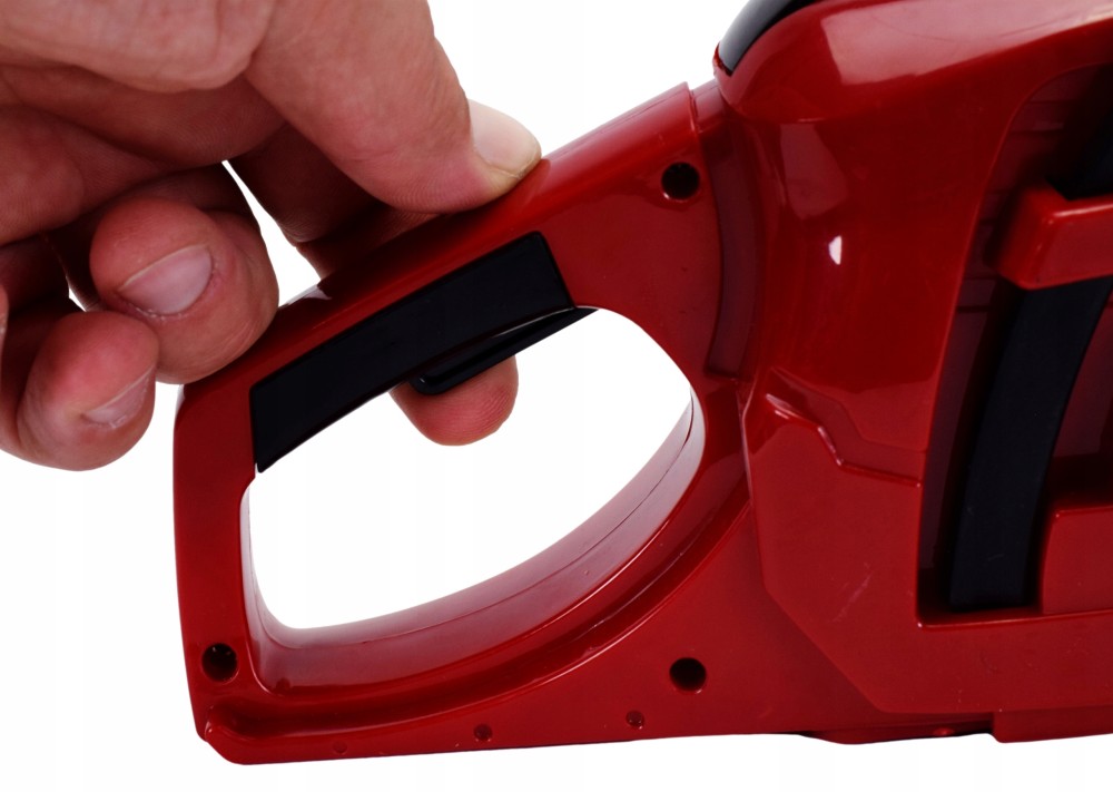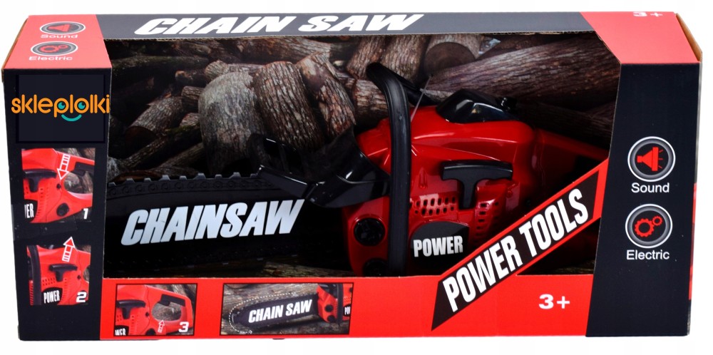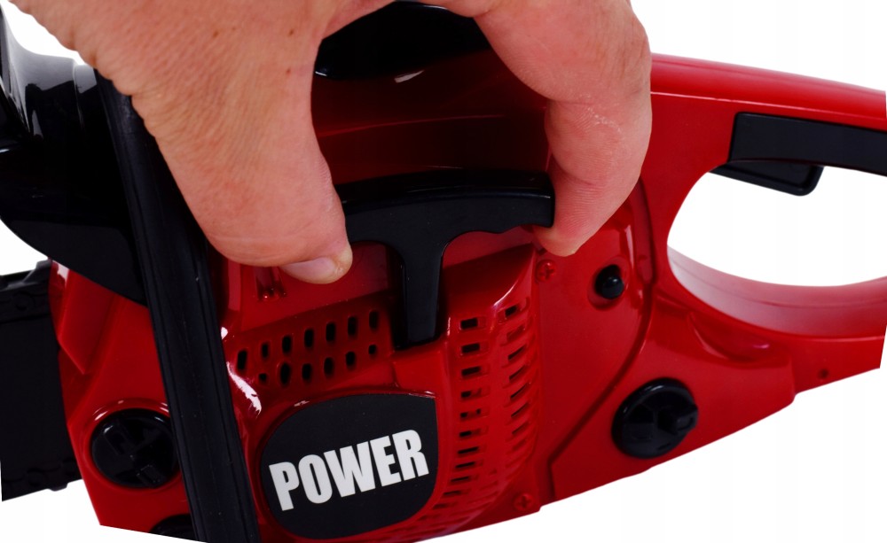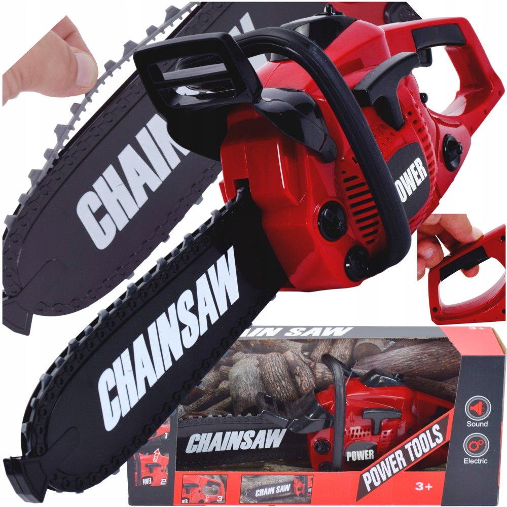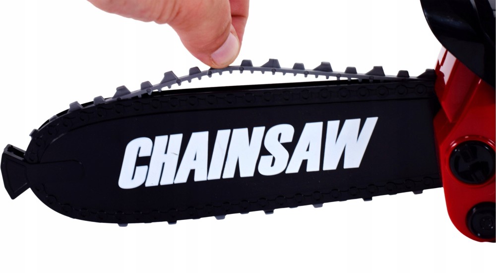 Când tragi de mâner, se aude sunetul unui motor care pornește, iar când apeși butonul „accelerație”, se aude sunetul realist al tăierii lemnului și lanțul de cauciuc se rotește.