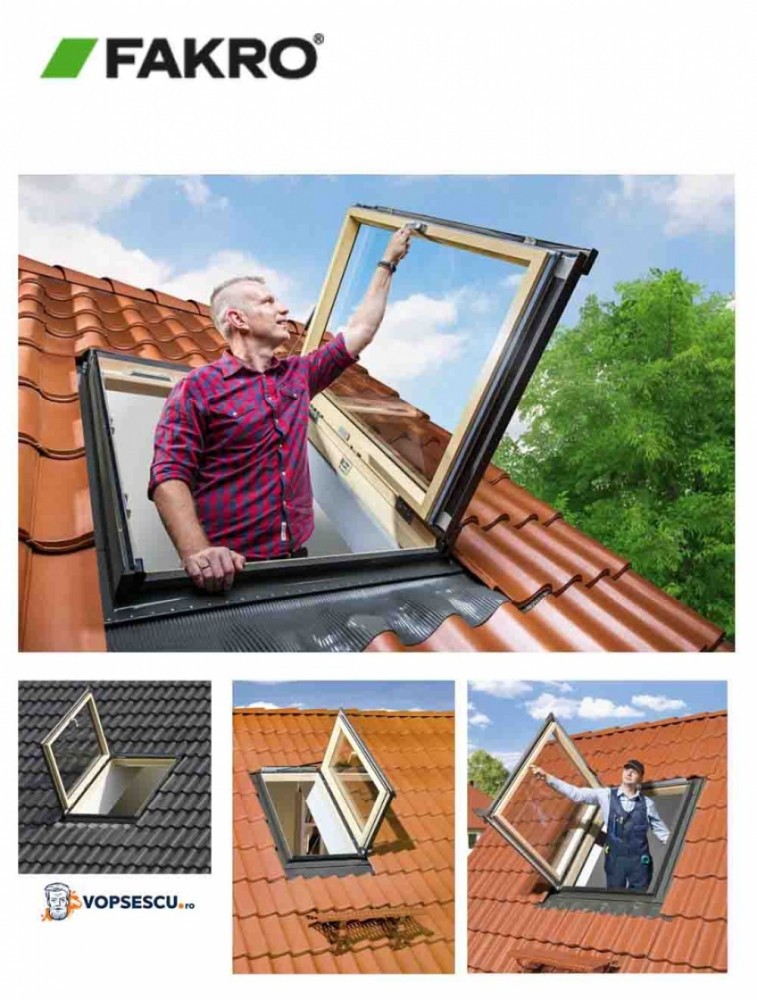 Ferestre mansarda acces acoperis FAKRO FWP U5 termoizolante cu deschidere laterala combina avantajele ferestrelor de mansarda cu avantajele ferestrelor de acces pe acoperis: asigura lumina naturala, permit aerisirea încaperii si ofera acces usor si sigur la acoperis pentru lucrari de întretinere (de ex. a cosurilor de fum, învelitorii, etc). Datorita parametrilor de izolare termica ridicata, Ferestrele mansarda acces acoperis FAKRO FWP U5 THERMO sunt destinate spatiilor locuibile. Ferestre mansarda acces acoperis FAKRO FWP U5 THERMO sunt echipate cu amortizor de gaz instalat în partea de sus a cercevelei care usureaza deschiderea ferestrei si o mentine deschisa. Mânerul amplasat la jumatatea înaltimii batantului, permite operarea usoara si fixarea ferestrei în doua pozitii de întredeschis pentru ventilatie.