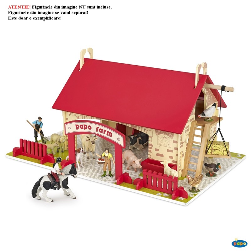 Ferma Papo din lemn-Prima mea ferma Figurinele Papo se vand separat. Dimensiuni : 61cm x 31cm x 40cm Varsta recomandata 3ani + Necesita asamblare sub supravegherea unui adult Pentru completarea decorului de joaca va recomandam utilizarea covoraselor speciale concepute pentru acest castel. (cod TV575, dimensiuni: 1 x 1.5 m)