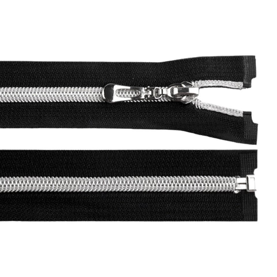 Fermoarul din poliester are dinti argintii. Se poate folosi pentru sacouri, jachete, hanorace sau genti sport. Zip-ul este deschis. Calaretul este din metal nemagnetic, extragatorul care il conecteaza cu fermoarul este magnetic.