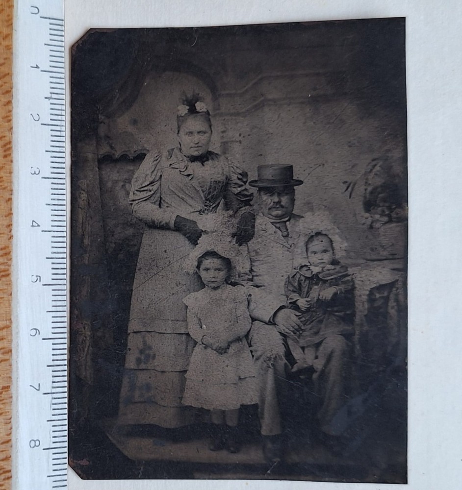 Ferotip (Tintype) familie – cca 1895–1900 – format mic 6×9 cm – studio