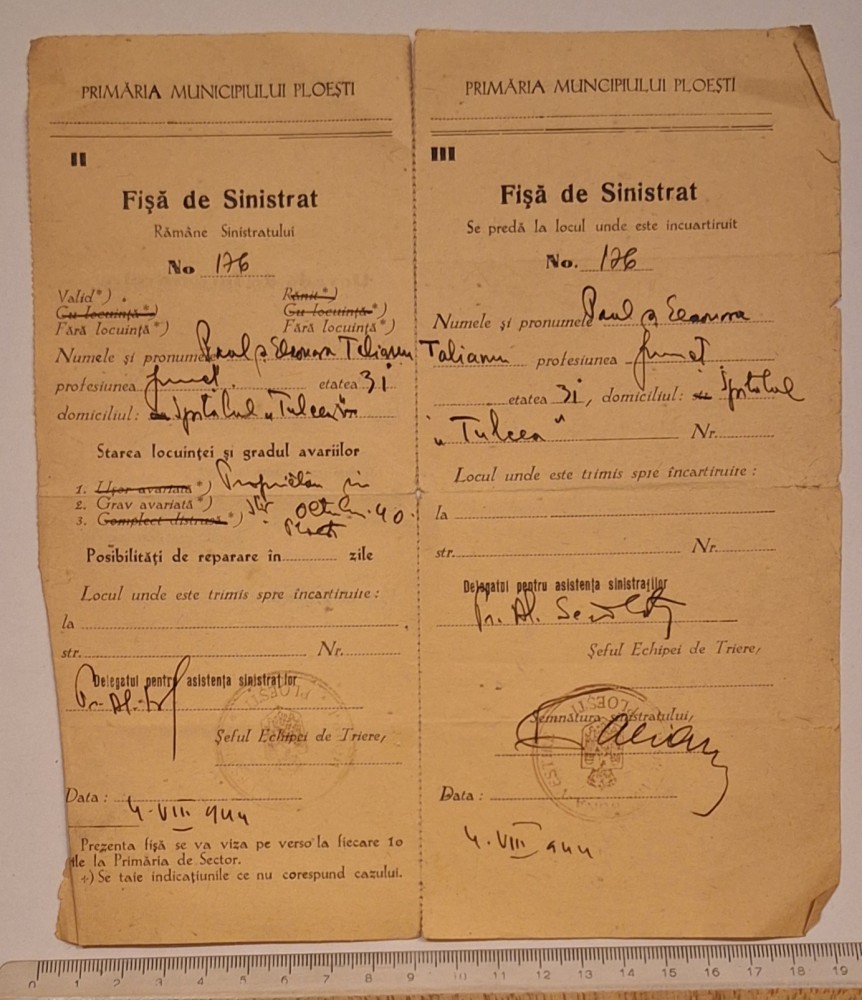 Fișă de sinistrat Primăria Ploiești – august 1944 – document original WWII – cu ștampilă și semnături