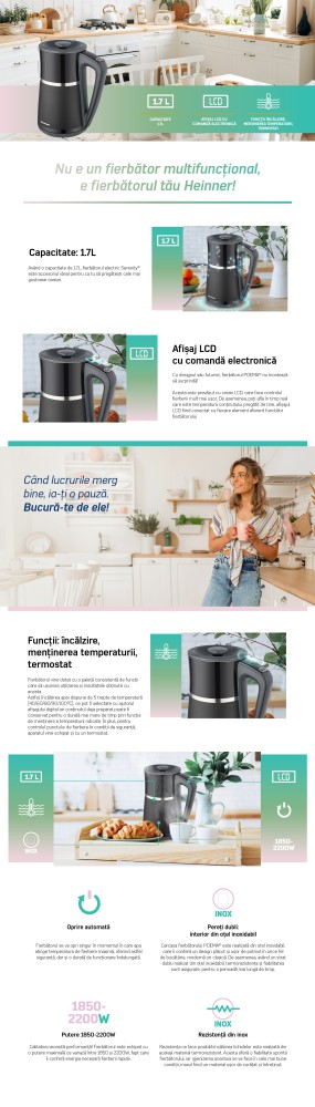 Fierbator electric Heinner, 1850-2200 W, capacitate 1.7 l, afisaj LCD, comanda electronica, oprire automata