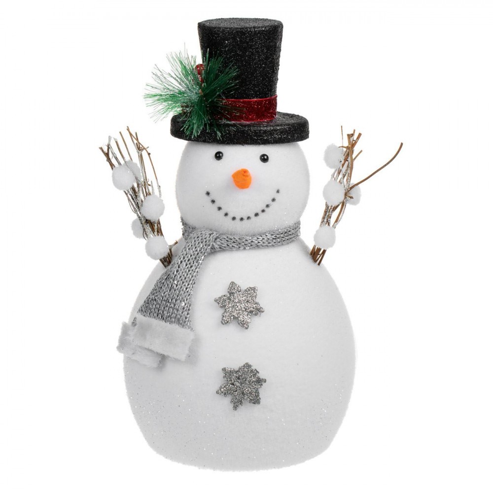Figurina Crăciun, Om de Zăpadă, 37 cm, Alb, Pălărie Neagră, Fular Gri, Glitter Argintiu