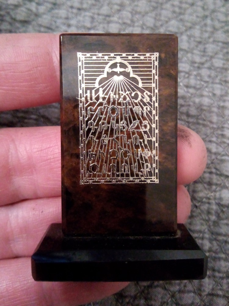 Figurina decor alfabet armenian pe stativ de culoare maro, cu inaltimea de 5.5 cm, folosit in stare buna