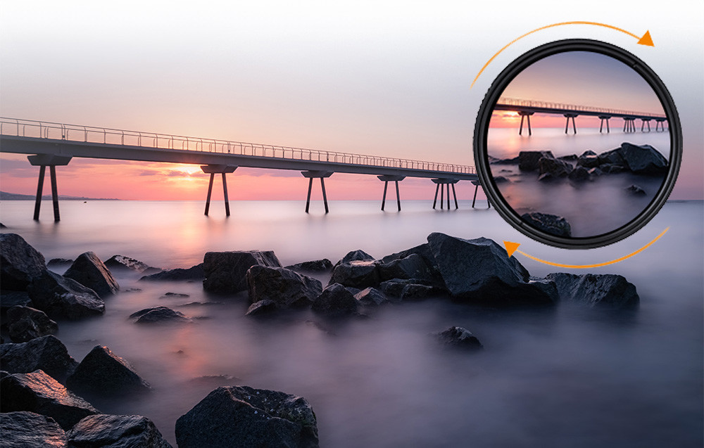 Filtrul ND ofera ND8-ND2000 reglabil la infinit. Acest lucru va permite sa reglati nivelul de lumina care intra in obiectiv. Se va dovedi util la fotografierea scenelor dinamice, cum ar fi apa curgatoare sau obiectele in miscare, permitandu-va sa creati efecte de blur.