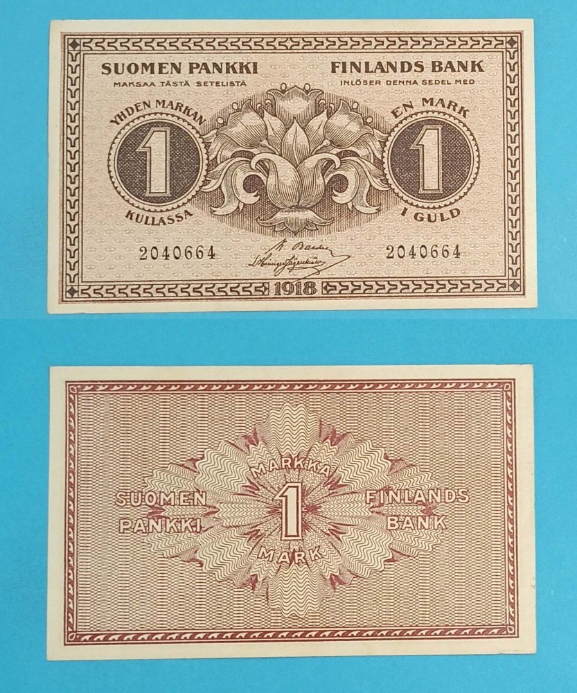Finlanda (pick 35) 1 Markkaa 1918 aUNC serie: 2040664; Emisa in perioada guvernul provizoriu (1917-1919); faţă: Floare; verso: Valoarea, elemente decorative; material: hârtie; dimensiuni: 100x60 mm;