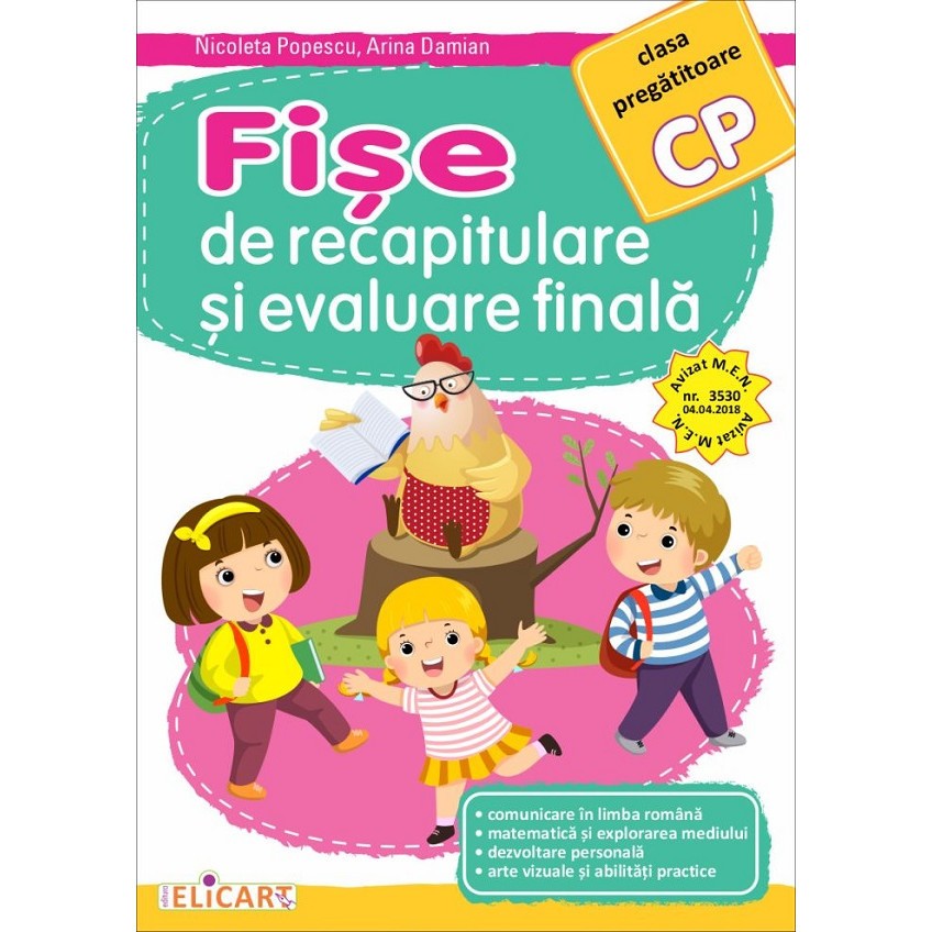 Fise de recapitulare si evaluare finala pentru clasa pregatitoare: comunicare in limba romana. matematica si explorarea mediului. dezvoltare personala. arte vizuale si abilitati practice avizat m.e.n. prin ordinul nr. 3530 din 04.04.2018 testele propuse de acest auxiliar sunt strans legate de temele studiate in timpul anului scolar (si regasite in curriculum-ul clasei pregatitoare): animale domestice si salbatice, corpul omenesc, legume si fructe, figuri si corpuri geometrice, masurarea timpului, bani, univers/planete, anotimpuri etc. scopul declarat al autoarelor este fixarea mai temeinica a tuturor acestor notiuni. exercitiile au ca suport desene atractive, care il fac pe copil sa inteleaga mai bine enuntul sau cerinta. acolo unde a fost necesar, au fost introduse si modele de rezolvare. prin varietatea temelor si prin caracterul transdisciplinar al fiselor de lucru (comunicare in limba romana, matematica si explorarea mediului, dezvoltare personala, arte vizuale si abilitati practice), auxiliarul se constituie intr-un instrument eficient de evaluare in perioada recapitularilor de la sfarsitul clasei pregatitoare.