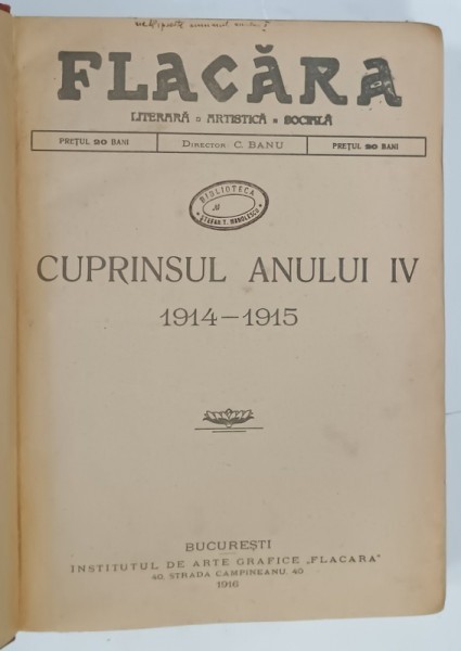FLACARA , REVISTA LITERARA , ARTISTICA , SOCIALA , ANUL IV , CONTINE NUMERELE DE LA 1 LA 52 INCLUSIV , OCTOMBRIE 1914 -OCTOMBRIE 1915