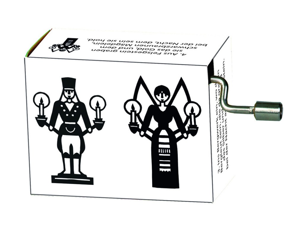 Flasneta Catecul minerilor Flasneta cu mecanism confectionat din lemn si metal, avand carcasa din carton. Melodie: „Steigerlied” AVERTISMENT: Contraindicat copiilor sub 3 ani. Contine parti mici ce pot fi inghitite. Pericol sufocare. A se utiliza sub directa supraveghere a unei persoane adulte. Producator: Fridolin, Germania Dimensiuni: 6 cm