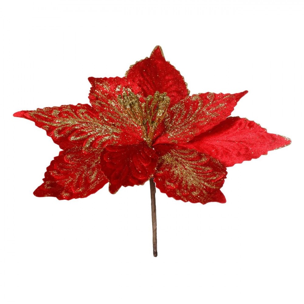 Floare Crăciun Decorativă, Model Crăciuniță, Petale Roșii, Glitter Auriu, 26cm