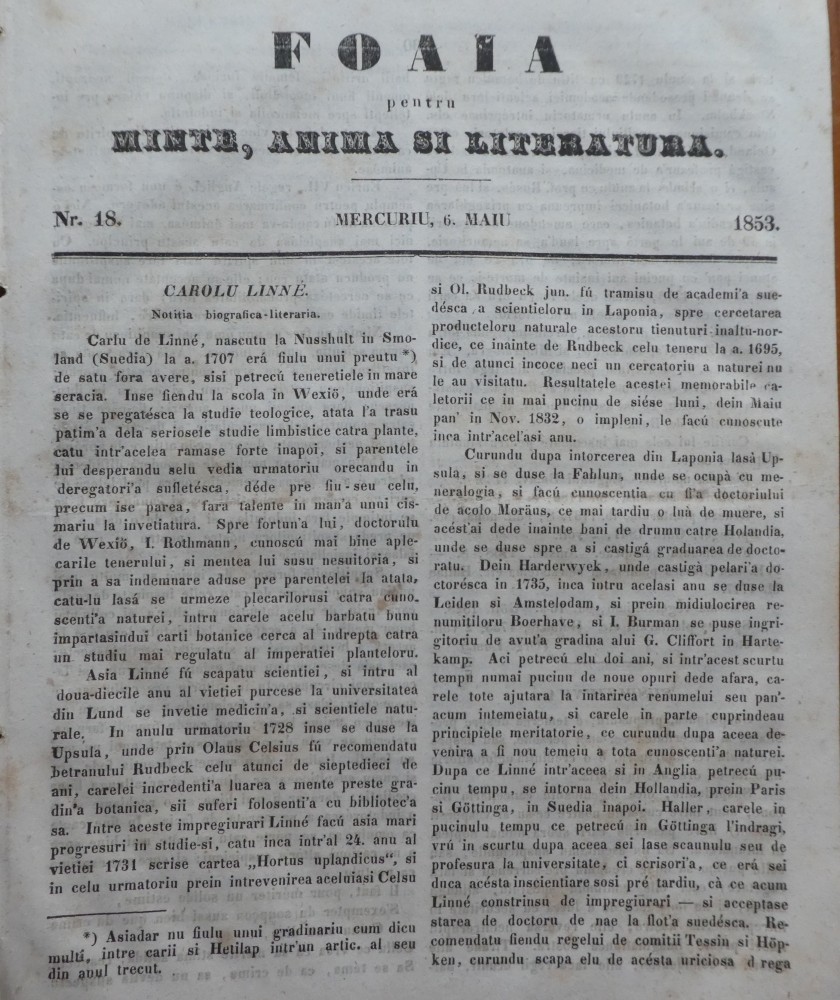 Foaia pentru minte, inima si literatura, nr. 18, 1853, Brasov, Redactor Iacob Muresanu
