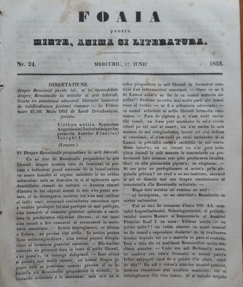 Dimensiuni: 24,5 x 20 cm, 8 pagini. Foaie pentru minte, inima si literatura a fost o revista romaneasca cu caracter cultural, aparuta la Brasov intre 2 iulie 1835 si 24 februarie 1865 (cu unele intreruperi). A fost condusa de George Barit, iar incepand cu 1850 de Iacob Muresanu. Publicatia a avut un mare rol in dezvoltarea culturii romanesti progresiste. In paginile ei au fost dezbatute, dintr-un unghi de vedere in general iluminist, chestiuni ca: emanciparea culturala si politica a poporului roman, ridicarea lui economica, rolul educativ si cetatenesc al teatrului, necesitatea unei bune organizari a invatamantului, lupta pentru unitatea si cultivarea limbii si pentru propasirea literaturii originale, stimularea culegerilor folclorice, etc.Revista a dus o indrazneata campanie impotriva despotismului, in numele ideilor generoase, si a salutat cu entuziasm revolutia de la 1848. Au colaborat la ea personalitati din toate provinciile locuite de romani: Ion Heliade-Radulescu, Ion Ghica, Cezar Bolliac, Dimitrie Bolintineanu, Alecu Russo, Costache Negruzzi, Ion Ionescu de la Brad, Andrei Muresanu, iar difuzarea ei peste munti s-a realizat de librarul Iosif Romanov din Bucuresti.