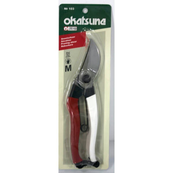 Marimea M. Aceasta foarfeca universala profesionala fabricata de Okatsune din Japonia este excelenta pentru taierea rapida si usoara a ramurilor de pana la 25 mm cum ar fi arbusti, vita de vie, trandafiri sau pomi fructiferi. Okatsune 103 este cea mai populara dintre cele trei foarfece ale acestei game avand o lungime de 200 mm ceea ce o face potrivita pentru toti utilizatorii cu mana medie. Gama de foarfece Okatsune se remarca printr-o functionalitate perfecta specific japoneza completata de o constructie simplista si eleganta. Lamele sunt forjate din otel de cea mai buna calitate (Yasugi Steel) cu o duritate ridicata (60-61 pe scala Rockwell), dar cu o flexibilitate speciala astfel incat lama taietoare sa se alinieze permanent cu contra lama chiar si dupa o utilizare intensa. In acest fel lamele raman ascutite o perioada lunga de timp asigurand constant o taiere curata, precisa si fara efort. Potrivita utilizatorilor cu mana mai mica Diametru de taiere de pana la 25 mm Lungime totala 200 mm Lungime lama 55 mm Greutate 202 g