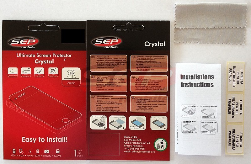 Pachetul contine instructiuni de folosire, etichete adezive pentru inlaturare praf si laveta.
